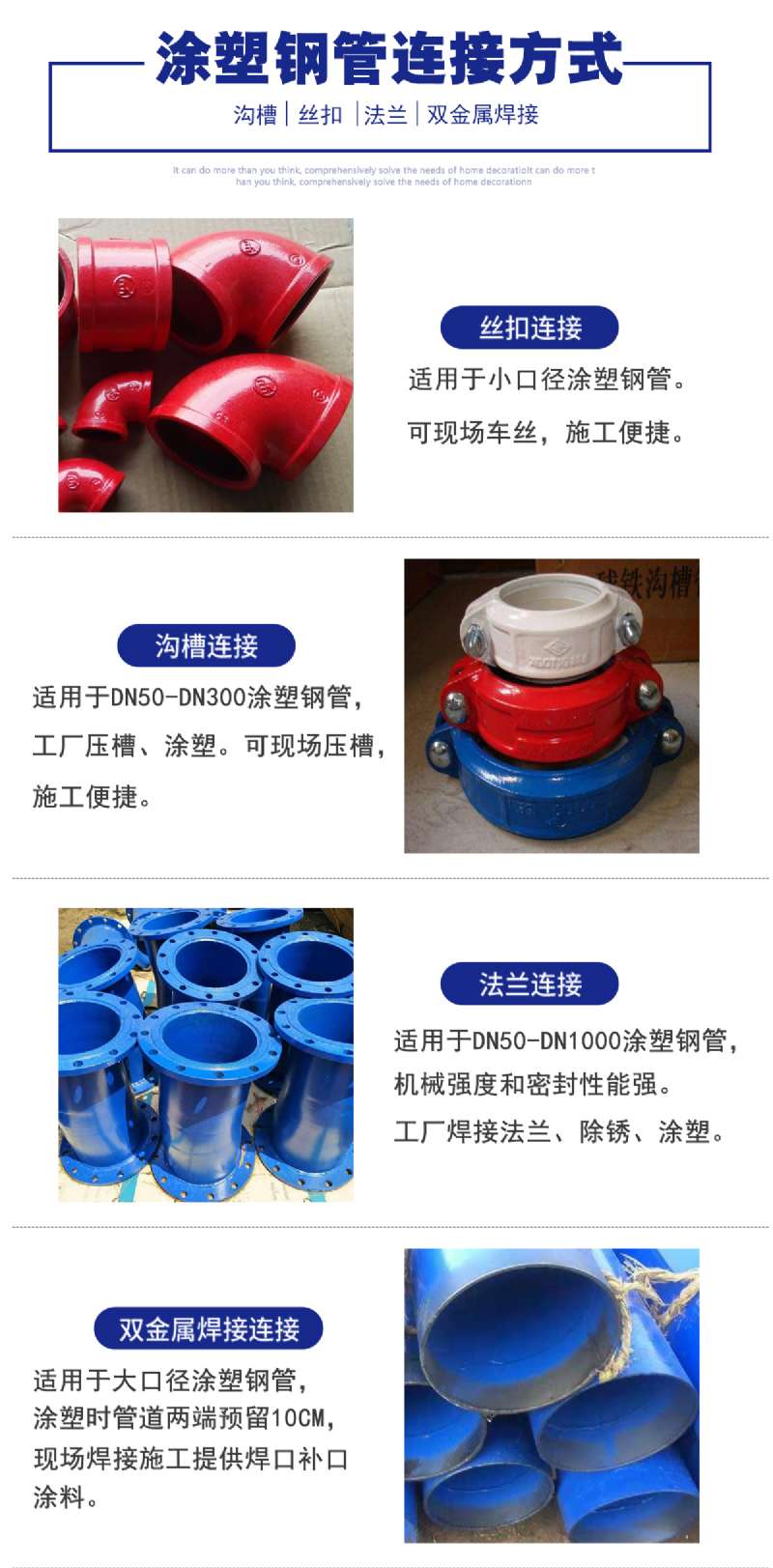 承插連接,又稱擴口連接。是通過改變管道連接件的密封連接結構,使其從根本上解決管道連接中的滲水難題,擴口連接保證了管連接件與涂塑鋼管的密封連接性。施工操作簡單方便,主要用于穿線管路使用。
