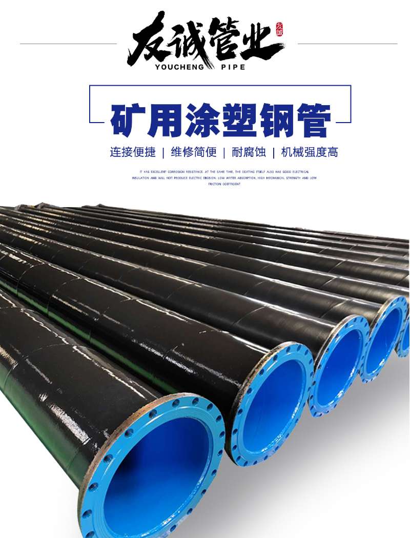 礦用雙抗涂塑鋼管適用于-30℃—120℃的工作環境,與其他金屬管、塑料管、復合管比較,它歸納 了各種管道的特色,既有鋼管的強度,又有塑料管的耐腐蝕、耐磨損,流體阻力小等特色,是一種安全衛生強度高,粘結強度好的綠色管道。友誠牌涂塑鋼管廣泛用于高層建筑給排水,消防噴淋,暖通、煤礦挖掘、電纜表里防腐
