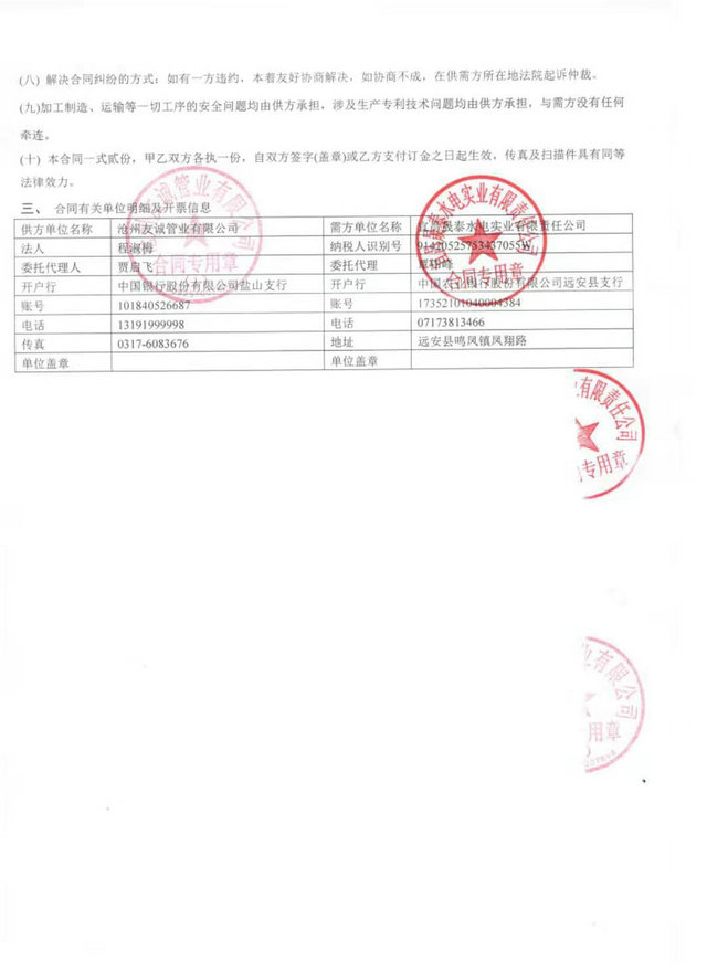 2019年10月23日友誠管業(yè)有限公司于宜昌市晟泰水電實(shí)業(yè)有限責(zé)任公司簽署了柔性承插口連接涂塑鋼管,從開始于譚總交談到來廠里考察,譚總對我們非常的信任認(rèn)可,我們一如既往的做好每一個(gè)業(yè)務(wù)