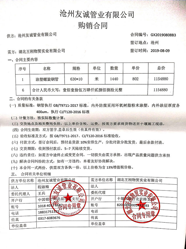 2019年8月9日我公司與湖北王剛物貿實業有限公司簽署購銷合同,市政管廊工程用DN600涂塑復合鋼管1440米,我公司專業于涂塑復合鋼管領域,目前國內多地區的管廊工程建設,給排水管道多用于涂塑復合鋼管,今后我們多重視于產品質量,提高服務