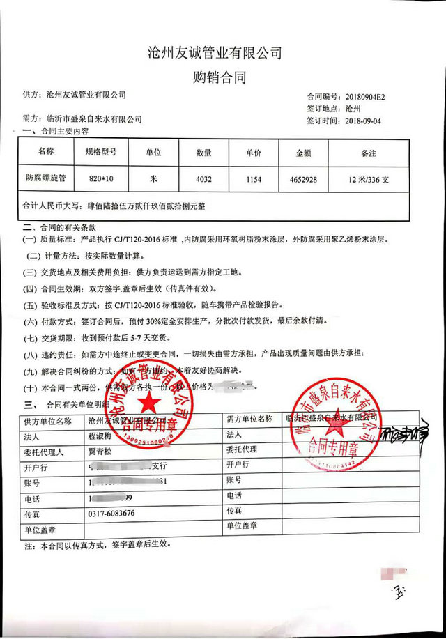 2018年9月我公司與沂州水務集團臨沂市盛泉自來水有限公司簽訂TPEP防腐螺旋鋼管購銷合同,DN800內外防腐鋼管4000米,感謝張總的信任,與貴公司的合同讓我們公司在自來水管道領域有了一個新的突破,歡迎各界領域客戶前來合作
